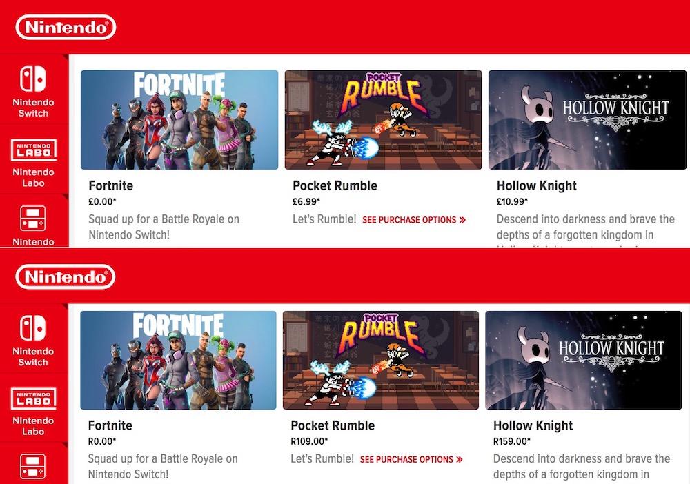 比如《空洞骑士》(Hollow Knight)这款热门动作游戏,在任天堂美国区和日本区 eshop 的售价分别是 15 美元(约合 100 元人民币)和 1480 日元(约合 90 元人民币),但到了墨西哥区就只要 150 比索(约合 53 元人民币)——相当于其他区一半的价格,性价比极高。