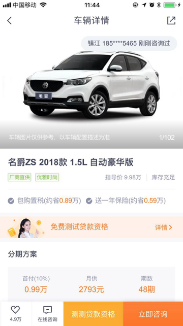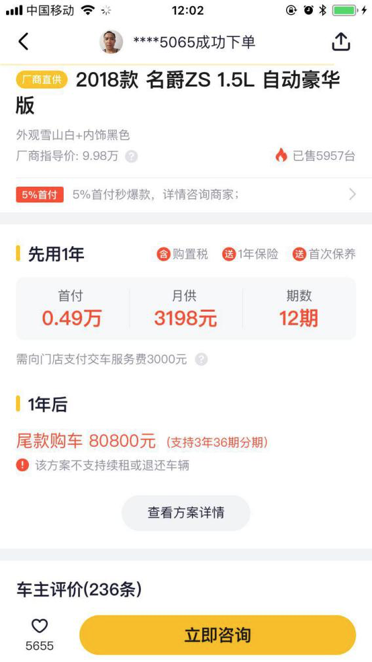 购买一台名爵ZS 2018款 1.5L 自动豪华版的车,在弹个车上总费用为147312元,具体涵盖:一成首付9900元、第一年分期12月每月2798元、尾款分期36个月每月2801元、提车服务费3000元;在毛豆新车上总费用为143964元,具体涵盖:一成首付0.99万、分期48期每月还款2793元。毛豆新车3000元履约保证金可以退还,故不计算在内,下不赘述。