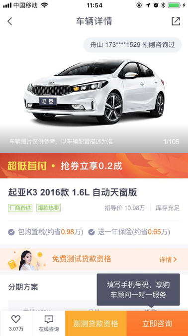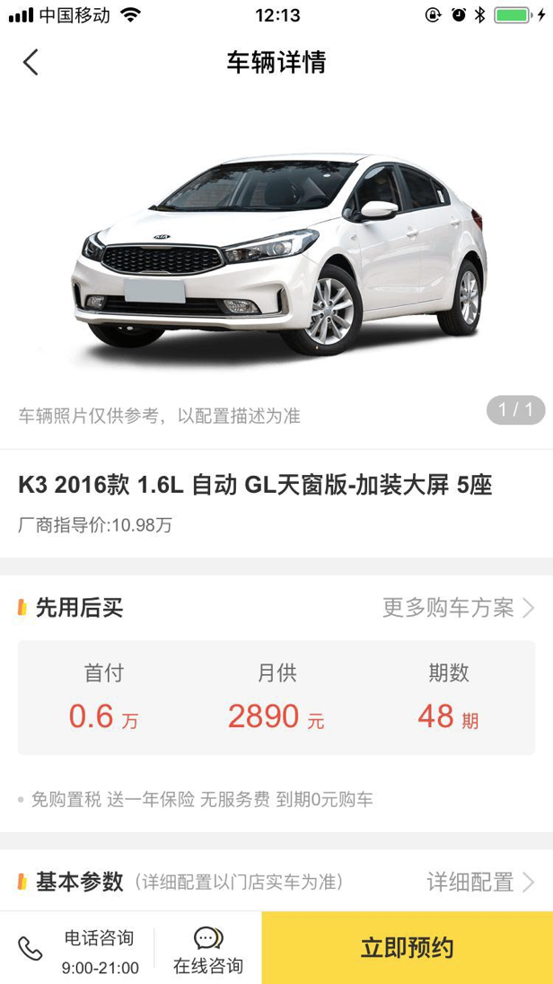消费者要购买这台起亚 K3 2016款 1.6L 自动天窗版,在毛豆新车上的总花费为139732元,费用如下:一成首付1.09万、分期48期每月2684元;在花生好车上总花费144720元,费用如下:5%首付0.6万,分期48期每月2890元。