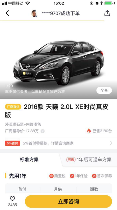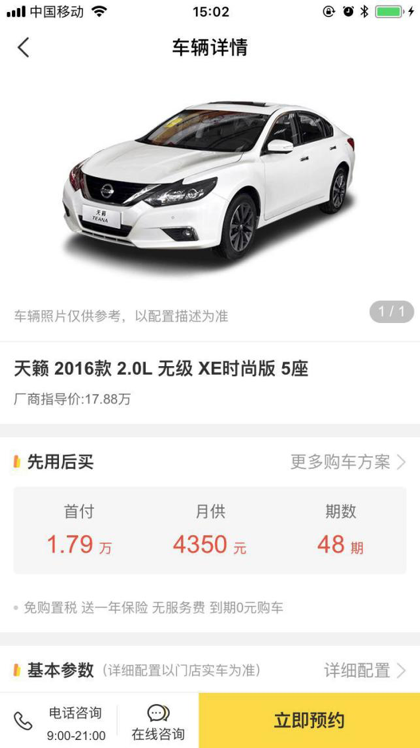 以日产天籁 2016款 2.0L XE时尚版为例,在弹个车上购买总共需花费239300元,费用涵盖:一成首付1.78万、第一年分期12月每月3398元、尾款分期36月每月4909元、交车服务费4000元;在花生好车上购买总花费226700元,费用涵盖:一成首付1.79万、分期48期每月还款4350元。