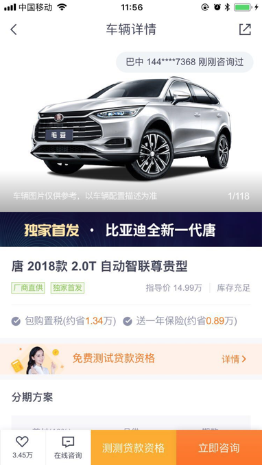以购买比亚迪 唐 2018款 2.0T 自动智联尊贵型为例,在大白汽车分期上总价格为238355.52元,具体包括如下费用:一成首付1.5万、分期48期每月还款4653.24元;在毛豆新车网上总价格为219236元,具体包括如下费用:一成首付1.49万、分期48期每月还款4257元。