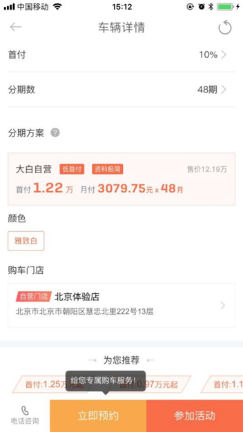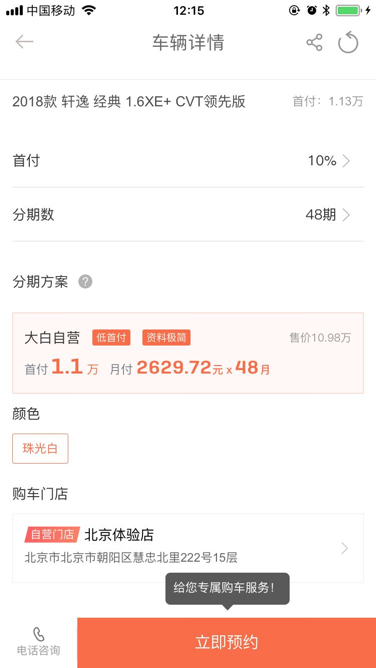 以购买一款2018款 轩逸 1.6XE CVT舒适版为例,用户在大白汽车分期上总花费为137226.56元,具体为:一成首付1.1万,分期48期月供2629.72元;用户在弹个车上总花费则为134092元,具体为:一成首付1.09万、第一年分期12月每月2498元、尾款分期36月每月2506元、提车服务费3000元。