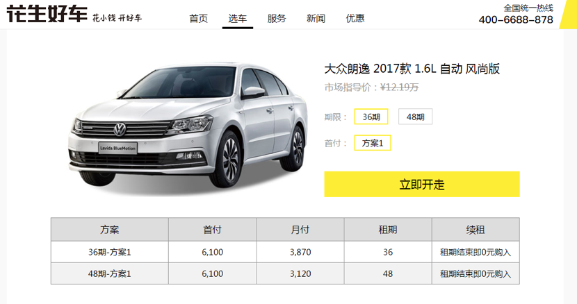 说明:由于四个平台上没有完全相同的车型,因而选择两两一组进行价格对比;弹个车为“1+3(年)”的模式,毛豆新车、大白汽车分期和花生好车则提供36期、48期等不同的分期选择。为了公允起见,平台间的对比均采用分48期进行比较。