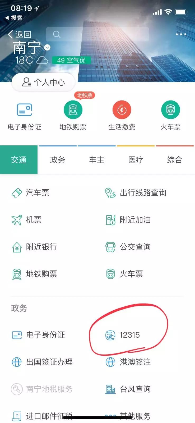 进入“城市服务”或在首页搜索“12315”