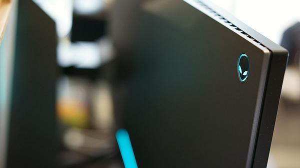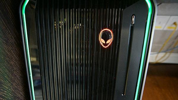 因为桌子上没有地方,只好将主机放置地板上。通上电源后,主机上的灯带亮起,灯带的颜色有专门的软件,可以根据喜好自由定义。针对主机背部的接口这里就不多说了。面板上这个外星人的标志怎么越看越喜欢,哈哈哈,我是不是中毒太深了呀。