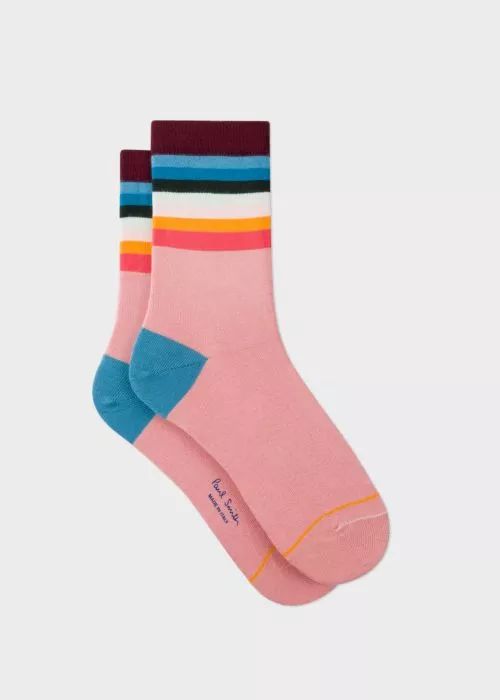 童心不减的 Paul Smith 把粉色袜子也设计得超有亮点,可以说是玩转粉色系色彩搭配的最佳典范!玩趣的多彩条纹搭配粉蓝色块,穿在整套着装下正好露出一截可爱的粉色,细节化时髦风格。
