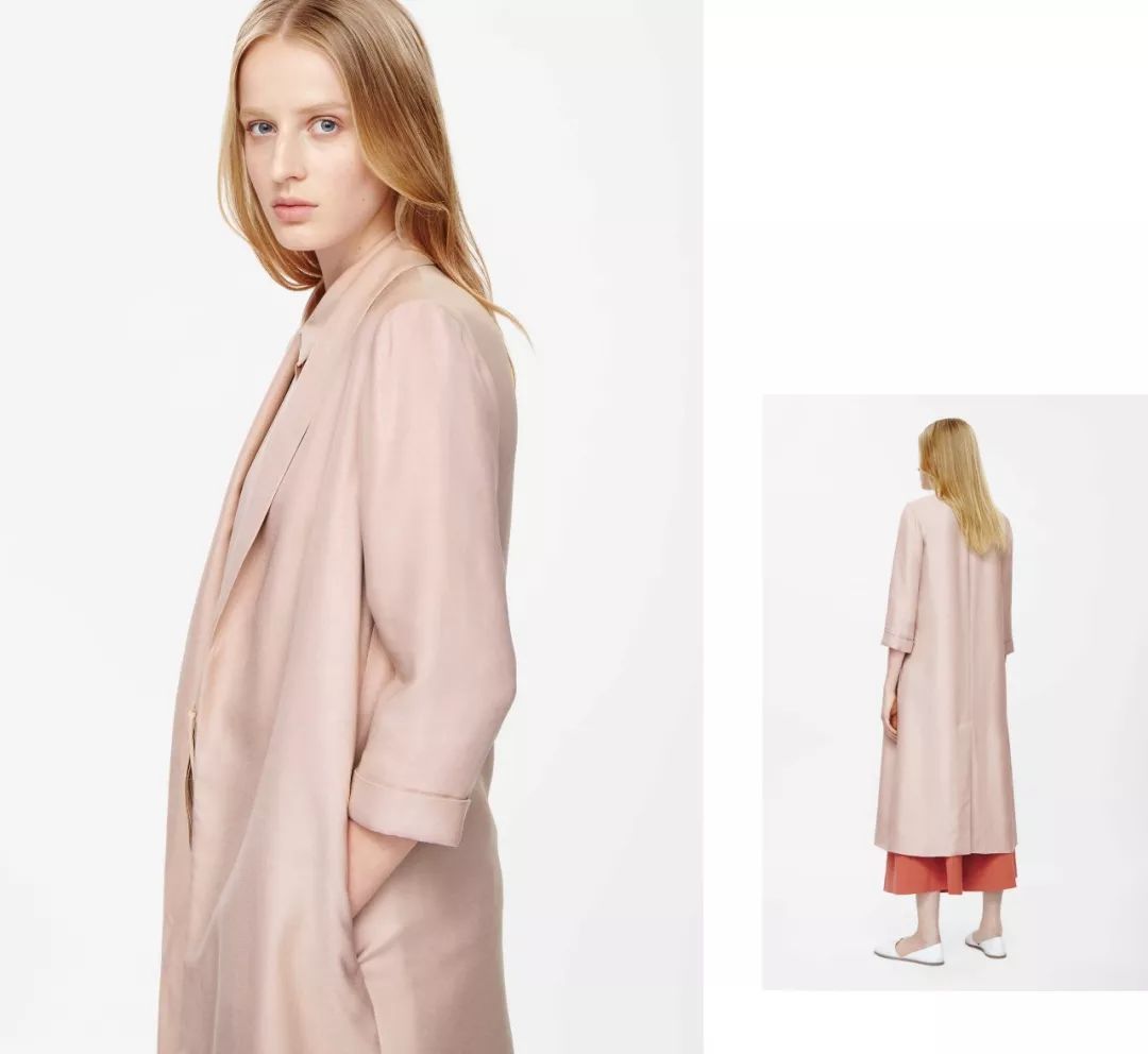 粉色也许不是最适合 Power Suit 的颜色,但饱和度较小的粉色有着黑灰白也不敌的冷淡感与高级感。Cos 的设计一向简约。偶尔披一件中性化粉色外套通勤,时髦之余也不会失了正装的严厉感哦。