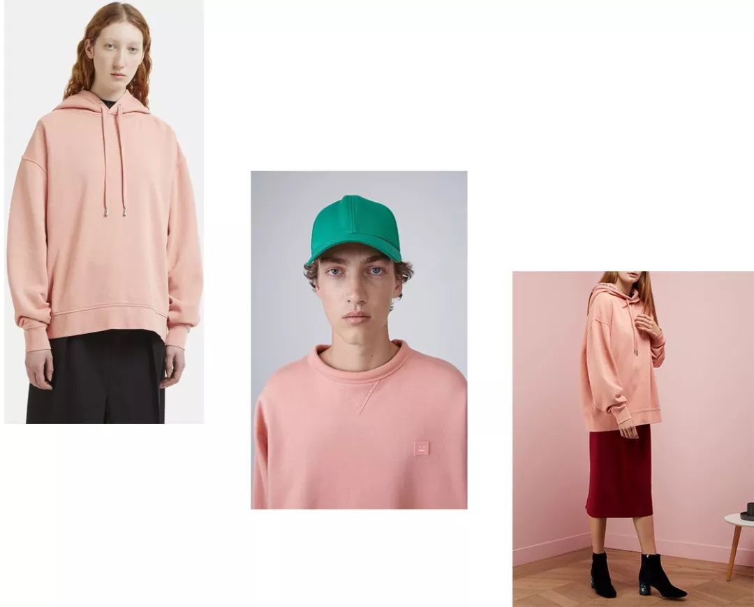 Acne 的粉色卫衣是淡淡的性冷感风,附带一个小而美的笑脸标志。淡粉搭配牛仔撞色或是同样淡色系的裙装都很美,有种说不出的魅力。