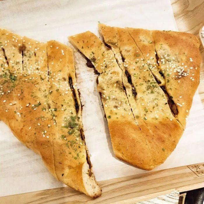 为了搭配新饮,他们家还出了一款极具中国气质的三角软欧包:梅菜肉肉。比一般的软欧包体积要大一些,吃起来也有几分烧饼的味道。