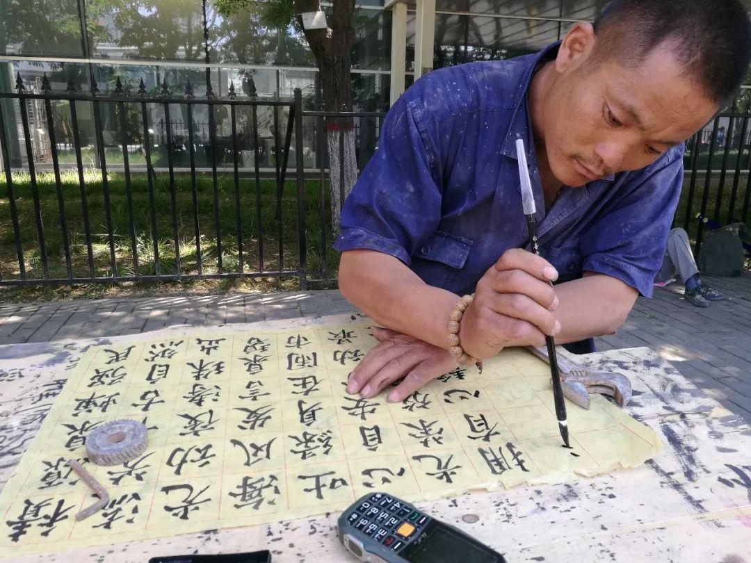 2017年5月16日,西安市南郊,在临时劳务市场的路边,一位钻孔师傅正在自己的三轮车上练毛笔字。 他的三轮车里装的,除了干活儿工具,最抢眼的是一沓练字的宣纸,有用过的还有没用过的。他说,本来挣钱就不易,等活儿的时候没事干,练字能让自己的心静下来。