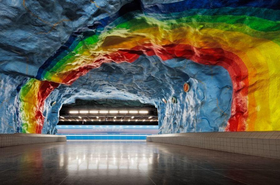 Stadion站,天蓝色的大理石岩壁,一道鲜艳的彩虹,再加上一些大型木雕,是艺术家为了纪念1912年在斯德哥尔摩举办的奥林匹克盛事而设计的。