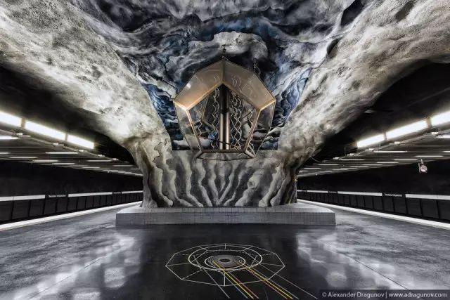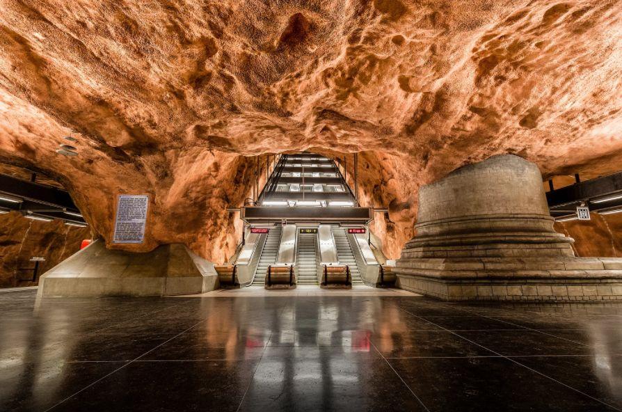 Rådhuset station(市政大厦站),1975年时,艺术家 Olsson 将这里打造成了一座棕色的地下溶洞,粗犷的天花板坑坑洼洼,透露出一丝原始的气息。