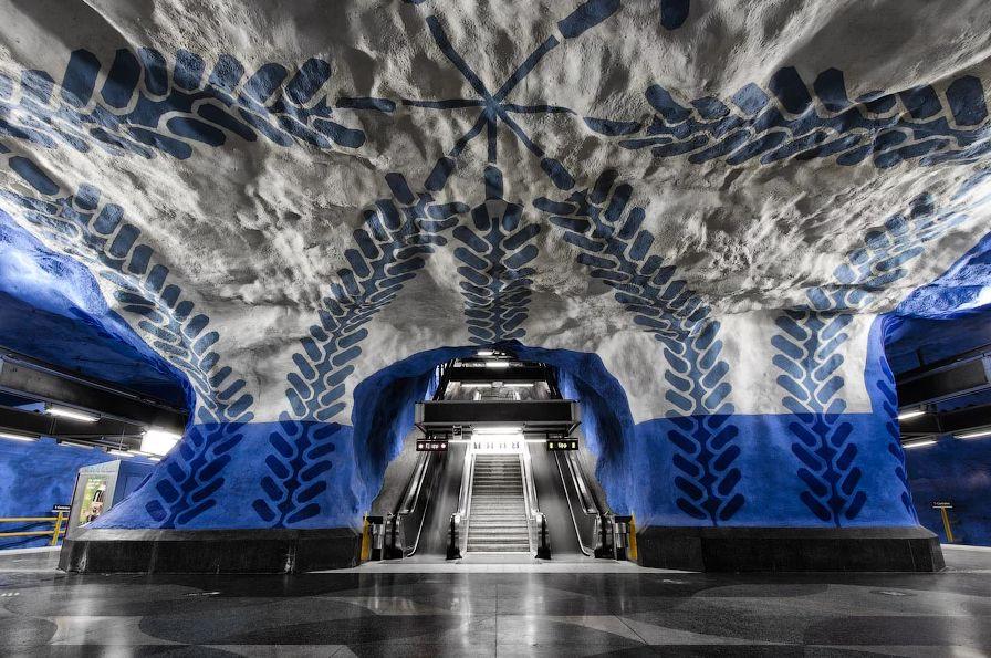 中央地铁站,这里是斯德哥尔摩最繁忙的地铁站,所以蓝色为主题的藤蔓图案会让人产生镇静的感觉。