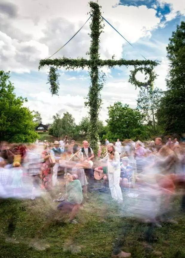 仲夏节是瑞典最大的节日之一,因为仲夏夜是要在乡村进行的,所以几乎所有的瑞典人都会提前离开城市,去往白桦树丛中迎接节日的到来。大家在广场的空地上竖起一根用花环桦树枝装饰的五月柱,在明朗的仲夏之夜,配合着小提琴和手风琴的表演,穿着民族服装的人们在柱子的四周跳着民族土风舞。