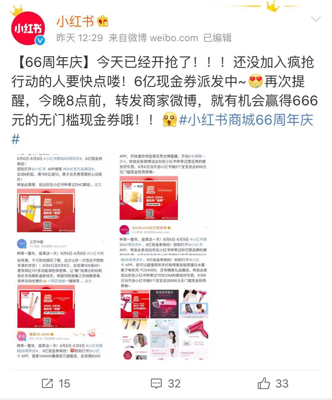 然而在明星进驻,赞助综艺,以及融资巨额的高频曝光率下,应是小红书事业高潮的转折年的2018年,截至发稿,只有昨日小红书官微12点29分推送一条6.6周年庆抢现金券的微博,除此网络上没有查到关于小红书2018年周年庆的销售额数据。不知道小红书是真的在财报上低调,还是未能给D轮领投东家交份好的答卷呢?