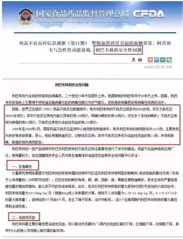 2006 年,国家药品不良反应信息通报(第 11 期)就警示过利巴韦林的安全性问题,最主要的毒性是溶血性贫血和生殖毒性:致畸性和致癌性。