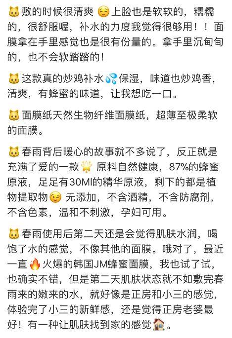 在春雨的大家族中有hin多的成员,而这款蜂胶面膜应该能算“门面款”了~87%都是蜂蜜原液,富含各种维生素和营养成分,能够有效保持肌肤水分。