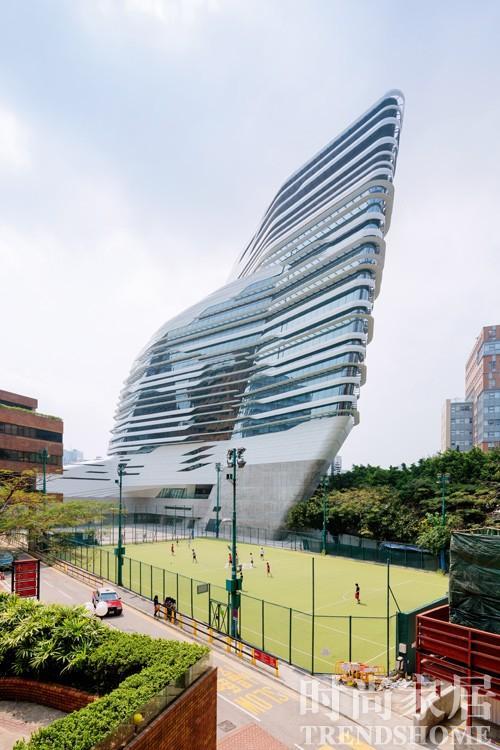 中国香港理工大学赛马会创新大楼的设计消融了塔楼和平台的组合类型,形成更流畅的形态。