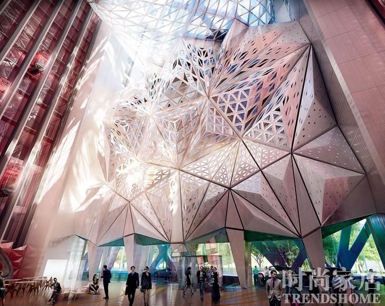 新濠天地酒店暴露的外骨骼增强了建筑的表现力和力量感,并且有利于优化内部空间。 1988 年,在纽约MOMA 举办的七人“解构建筑展”,可以看作是解构主义建筑派的“扎哈们”对整个建筑界的宣言,其中弗兰克?盖里、皮特?艾森曼至今依然是解构主义坚定的追随者。早期的扎哈深受俄罗斯“至上主义”鼻祖马列维奇和先锋派建筑大师莱尼多夫的影响,应用随机的几何构成对空间进行探索。在此之后的很长一段时间,扎哈的设计都由于太过前卫,或是难以付诸实施,而沦为一纸空谈,被舆论称之为“Paper architect”。整个上世纪80 年代,扎哈唯一建成的设计,就是位于德国小城维特拉的防火站。而这也是这一时期扎哈风格最典型的代表作,大量尖锐的几何形状通过不同的排列组合而分割出建筑的功能空间,让人不得不佩服建筑师本人对空间、构造、材料等元素的掌控力,但也不得不面对设计本身无法与当地环境对话的尴尬事实。这栋建筑仿佛就像是崩解前的太空船,从外太空唐突地迫降在地球这个遥远星球上,格格不入。 在后来的一次采访中,扎哈将自己的这段经历形容为一个“局外人”。伊拉克人的出身,使得刚到伦敦的她显得与周围环境格格不入;而以弱女子的姿态闯进男权当道的建筑界,则更是冷暖自知。而扎哈的个性就是这样,一如她惊世骇俗的设计般,她的言论同样犀利无比。在一次针对英国查尔斯王子有关现代主义建筑太过追名逐利而忽视环境和谐的抨击中,扎哈说道,“说我们都在害怕、我们不能再做地标性建筑、我们必须*退倒**,这也太简单化了。这到底是在说什么?” 而随着时间的推移,扎哈的解构主义渐渐开始向有机性回归。多年后,外形上同样被人比作外星飞船的韩国首尔东大门设计广场,则收获了另一番不同的评价——整个建筑几乎就是沿着所处地块边缘的形状而生,从地块中心缓慢向外抬升。建筑本身体积的不规则性,使得人们在每个角度都能看到新的形象与模样。建筑看起来绝世而独立,又与周围景物融为一体,成为东大门整体环境的一部分。