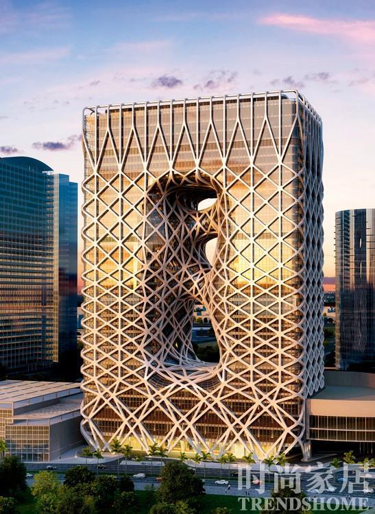 中国澳门特别行政区的新濠天地酒店,两个有机形桥梁强调塔中心外部空隙。