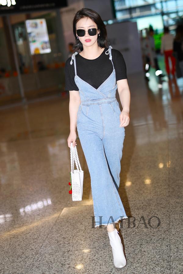 马思纯2018年4月10日上海机场街拍:身着Stylenanda吊带背带裤,拎Susan Alexandra手袋,戴迪奥 (Dior) 太阳镜