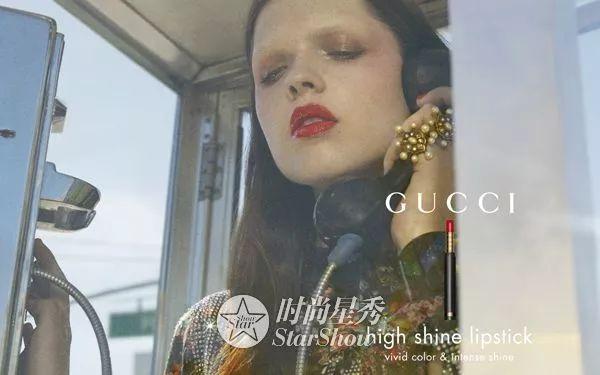 在平面广告与广告片中,模特Sedona Legge置身于电话亭内,手握听筒,镜头集中在她润泽鲜明的红唇之上,如梦似幻的阳光与蓝天映出她周围的城市景象,尽显性感妩媚女士气质。这幅由摄影师Petra Collins构想的意景,以慵懒复古的氛围,与模特自信眼神中流露出的摩登态度形成鲜明对比。艺术指导ChrisSimmonds则将城市的美丽风景显现于广告之中。在电话亭内,一支打开的Gucci High ShineLipstick炫彩闪漾唇膏置于一侧,搭配上这位摩登女郎浪漫的时尚配饰——水晶及珍珠复古耳环和粉色太阳镜,营造出唯美典雅的感觉。