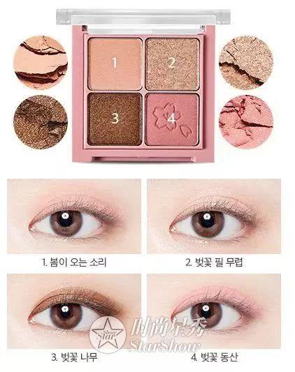 暖调四色眼影盘,颜色都很实用,适合春天。淡淡的粉色与大地色随意搭配或单色使用就是目前流行的完美眼妆。