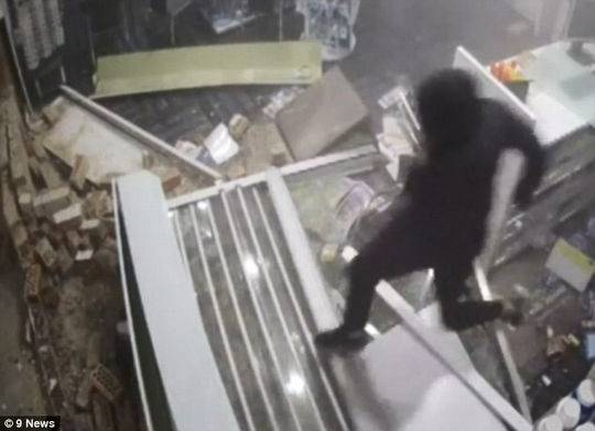 这名戴着兜帽的窃贼迅速跳下车,在一片狼藉的地面上跳来跳去,又穿过柜台进入商店的后面。之后,他手里拿着数盒药品,从店内跑出来回到车上,整个偷窃过程不超过60秒。