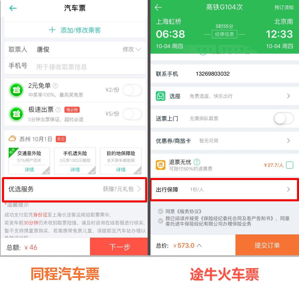 以同程和途牛为例,上图左侧为在同程旅游APP购买汽车票时的界面,右侧为在途牛旅游APP购买高铁票时的界面。同程默认附加了一项优选服务,途牛附加了出行保障,二者直观看上去均没有价格显示,但实际这是两项收费服务,同程的优选服务价格5元,途牛的出行保障价格20元。由于标识不够明显,且需要点击进入才会发现是收费项目,如果用户没有仔细视察的话,很容易在不知情时发生额外消费。