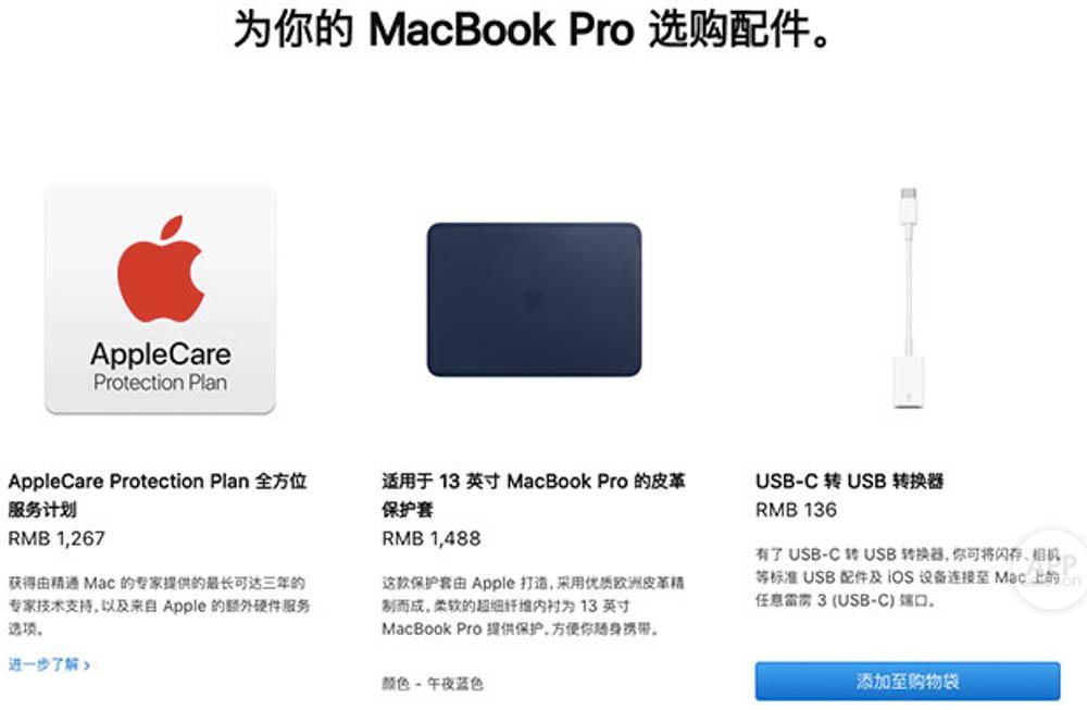 选好赠品,苹果还会提醒你是否要购买 Apple Care 或是皮革保护套等配件。Apple Care 同样享受教育优惠价,为原价的 8 折,如果还没考虑清楚,可以直接跳过,在 Mac 一年保修期内随时可购买,但就只能去线下购买了。针对 Mac 这类使用期限较长、损坏率较高的产品,我个人是建议买一份 Apple Care 有备无患。