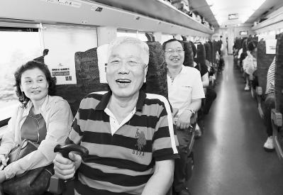 到泉州探亲的85岁香港居民杨金良(前右)乘高铁返回香港。