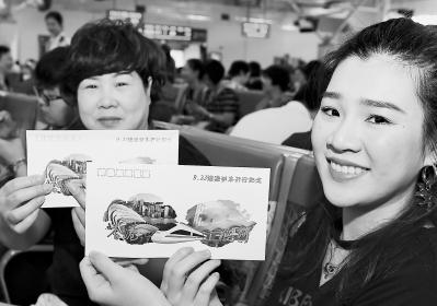 乘客在展示福州至香港高铁开通纪念首日封。