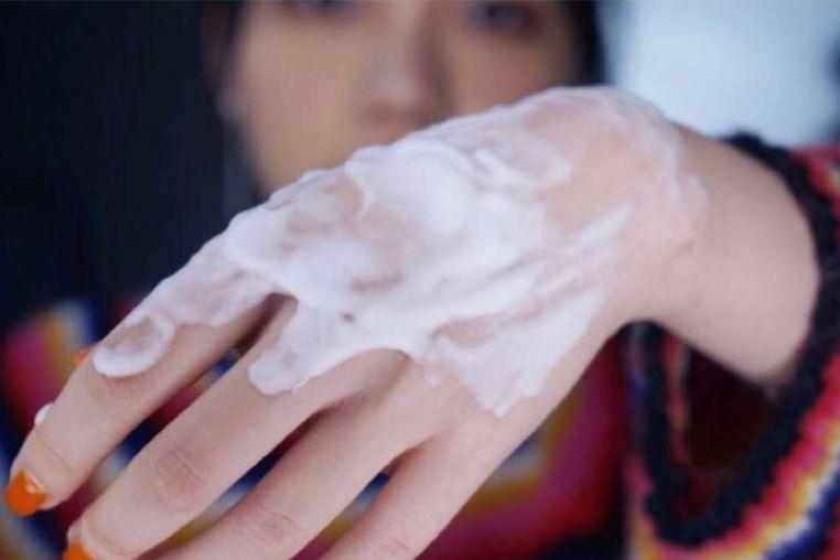 挤压出来是白色乳液状质地,双手打湿后可以搓出浓密泡泡。