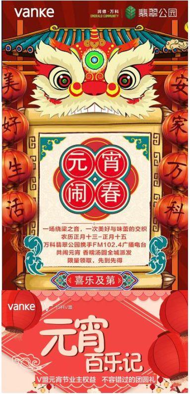 2、万科农历正月十三至十五,翡翠公园携手102.4广播电台共闹元宵,102,4广播听众或在朋友圈集满15个“赞”的民众即可至万科翡翠生活馆领取定制汤圆一份。业主除了可以直接去项目上领稻香村汤圆一份,还可以在2月28日-3月2日期间在“稻香村”勒泰店消费时享用优惠。
