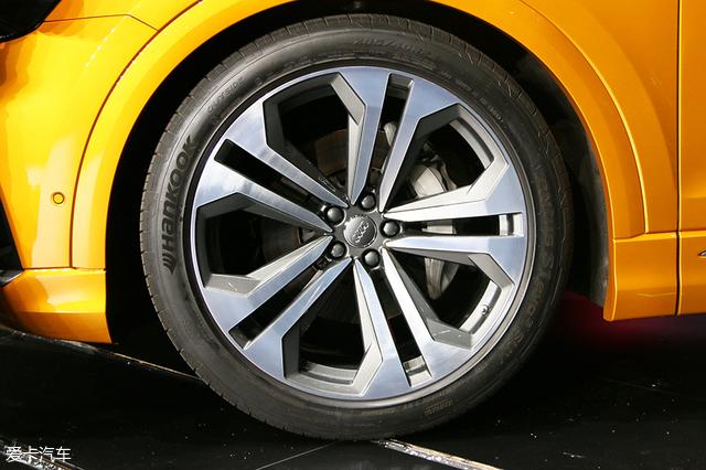 Q8标配19英寸轮圈,不过你要是嫌还不够大,还可以选装图中的22英寸。钻石状镂空设计很符合车型定位。另外,Q8前桥还装配了带固定铝制卡钳的六活塞刹车系统。不仅如此,Q8还使了用后轮转向技术,其后轮可在正负5°的范围内转动。