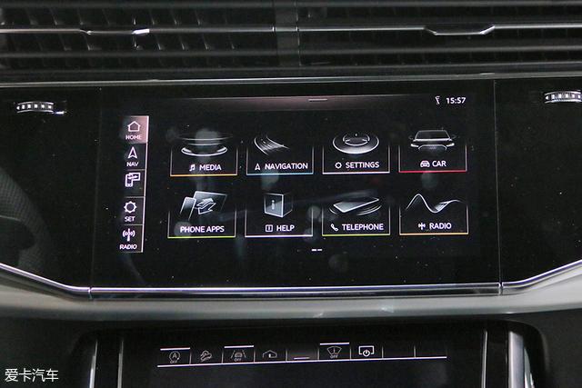 与新A8一样,Q8的内饰采用了极为简约的“大屏”风格。因为在整个车厢内基本找不到物理按键,取而代之的是中控台上下的两块大屏幕。