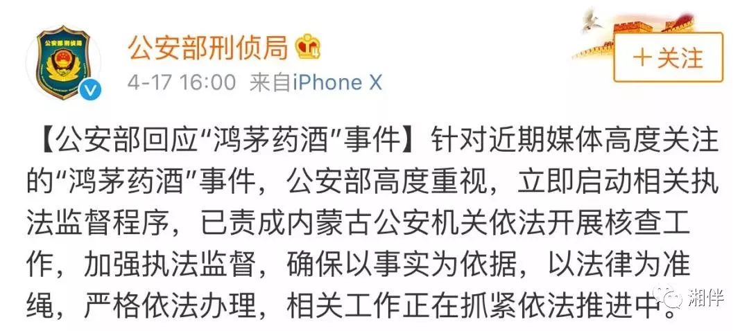 @公安部刑侦局 官方微博也于17日16时发布消息回应“鸿茅药酒”事件。