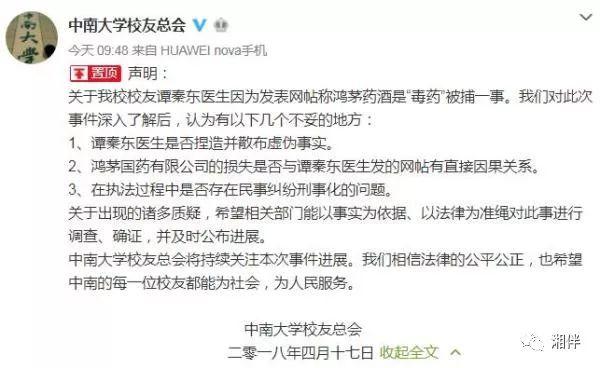 4月17日9时许,中南大学校友总会官方微博@中南大学校友总会 就“我校校友谭秦东医生因发表网帖称鸿茅药酒是‘毒药’被捕”一事发布《声明》。