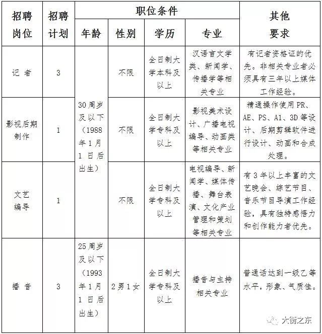 2、热爱广播电视事业,服从工作岗位分配和工作任务安排,具有吃苦精神、合作意识、创新意识;