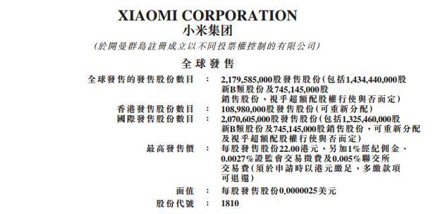 小米发布招股书,正式启动公开发售。招股书显示,小米香港IPO全球发售股份数目21.8亿股,最高发售价每股22港元,股票代码1810。