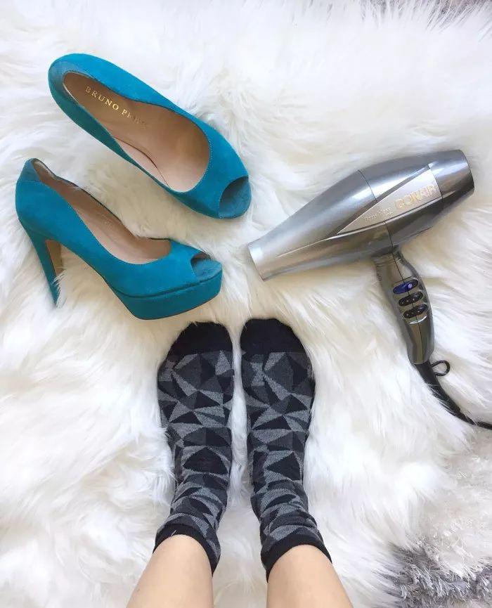 然后找出你冬天的厚袜子穿上,在鞋子冷却之前穿进鞋里,不停地走动。等鞋子冷却之后,再使用吹风机加热,一直到感觉鞋子差不多合脚就可以啦。