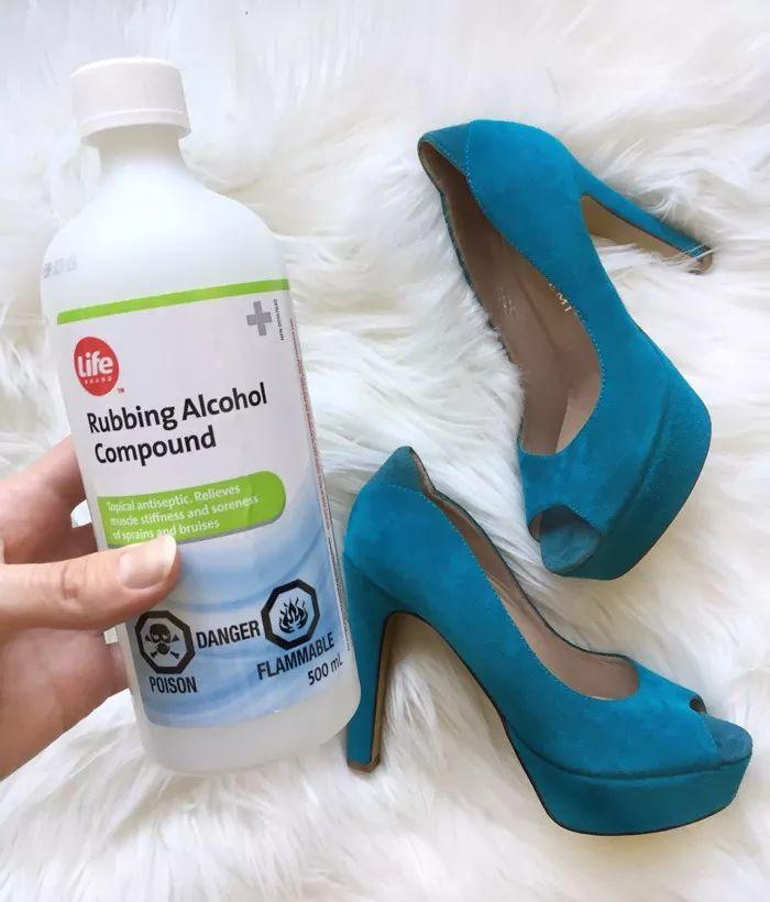 将酒精直接擦在鞋上,因为酒精会很快干燥所以要把鞋子放在潮湿的地方,第二天就能试着穿穿看合不合脚啦。