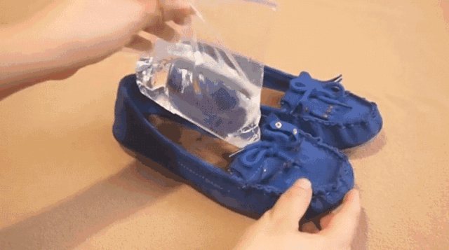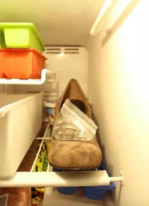 然后把鞋子放在冰箱里,等到水结冰以后会在鞋子里膨胀,拉伸鞋子。最后就可以从冰箱里取出鞋子和袋子,看看鞋子是不是很快变合脚啦?担心放冰箱里尴尬,可以用袋子包起鞋子,给它个独立的空间就好。