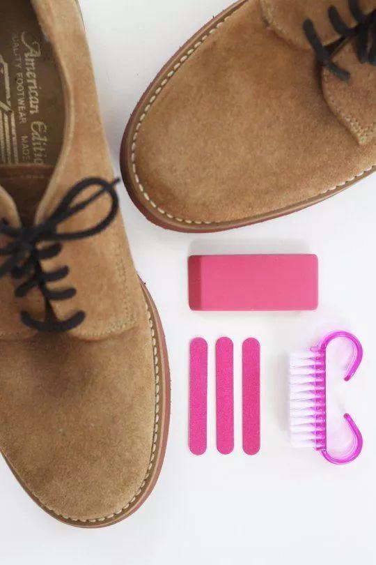 麂皮鞋上大多数的污渍可以用橡皮擦、牙刷和美甲用的抛光锉就能解决~用这些工具顺着一个方向轻轻摩擦污渍就能去除,千万别太用力哦,小心鞋面变秃就不美了。
