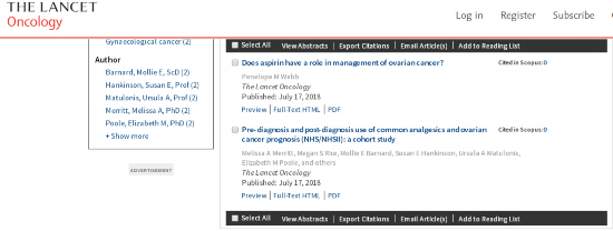 《柳叶刀肿瘤学》7月刊同期刊登了《阿司匹林对卵巢癌的治疗有作用吗?》与《一项定群研究(NHS/NHSII):关于确诊前后使用常见镇痛药与卵巢癌预后》。这两项研究均为回顾性研究,研究结果表明阿司匹林与卵巢癌防治具有一定的关联性。