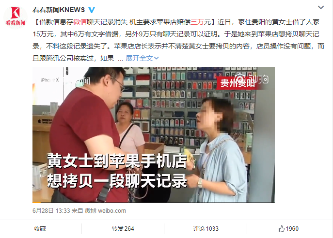 贵阳一女士因微信聊天记录莫名消失,丢失 9 万元借据