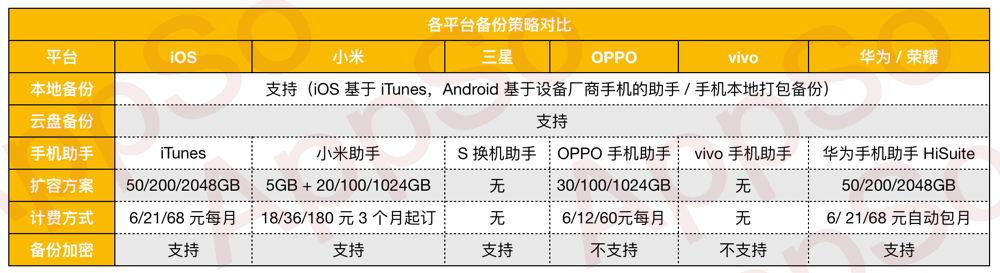 不过由于厂商不同,所以手机备份的方法和服务都各有存异。因此,我们做了一个整理表格,各家厂商的备份方式和扩容收费可以参考下表: