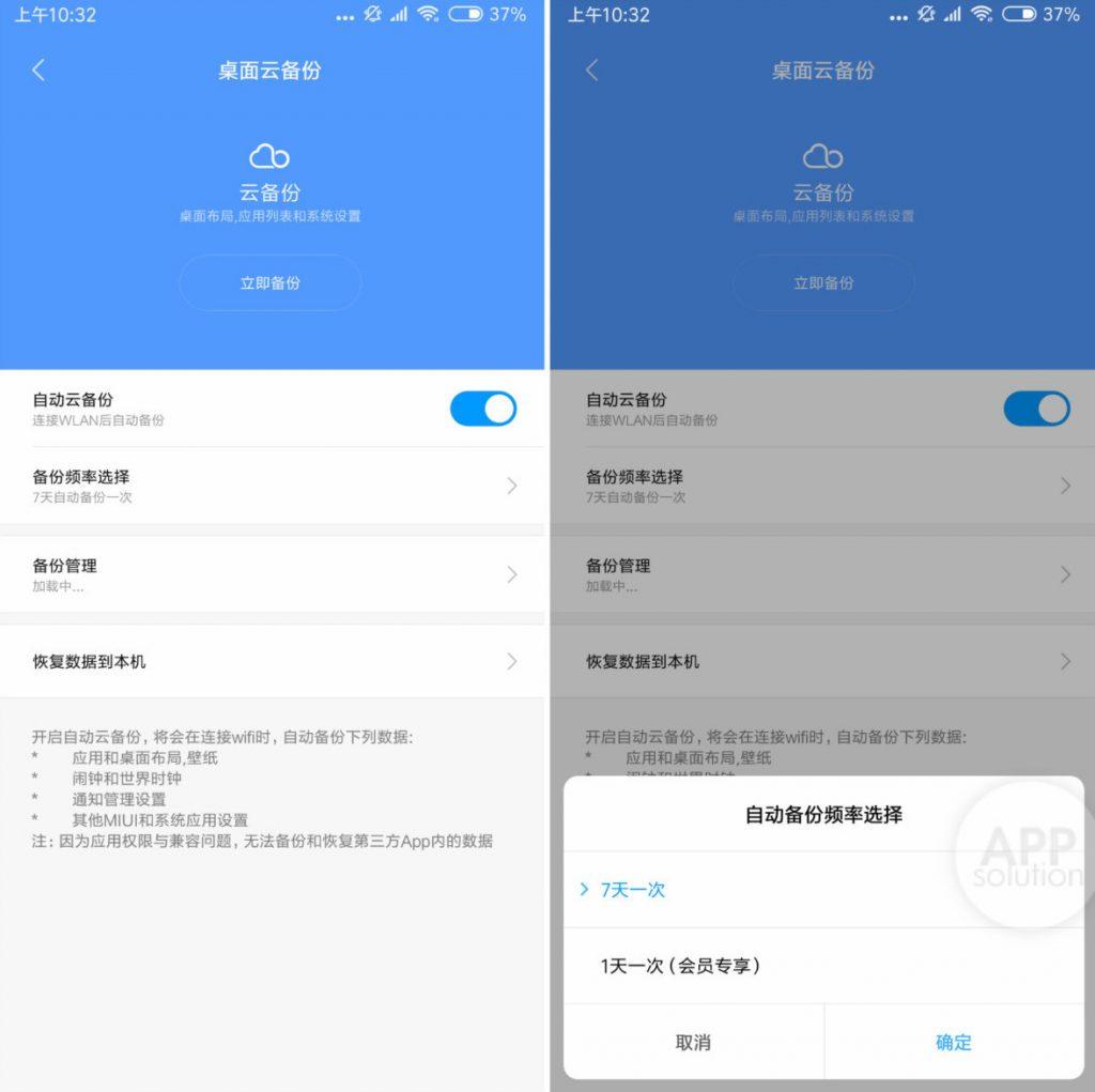 同时,MIUI 也提供了云备份服务,登录 ID 后,系统会自动备份桌面数据、联系人、短信、相册、通话记录、信息助手、浏览器数据、便签等内容。备份周期有 7 天一次和 1 天一次可选,但后者需要会员充值后才能使用。