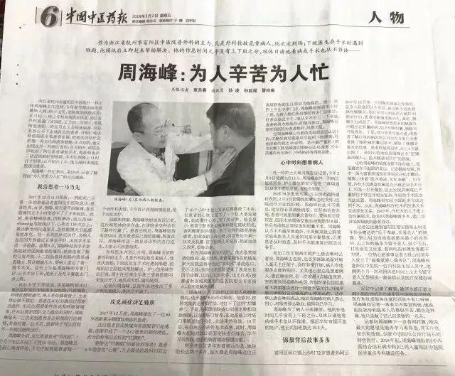 2018年3月2日,《中国中医药报》发表文章点赞杭州市富阳区中医院周海峰主任医师。