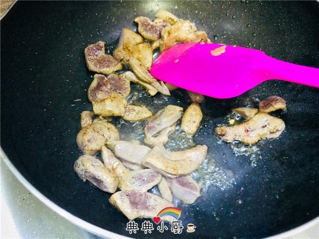 4,蘑菇炒好后倒入之前炒好的猪肝然后再凉水。烧汤的时候,或者做肉丸的时候,都会选择凉水下锅。